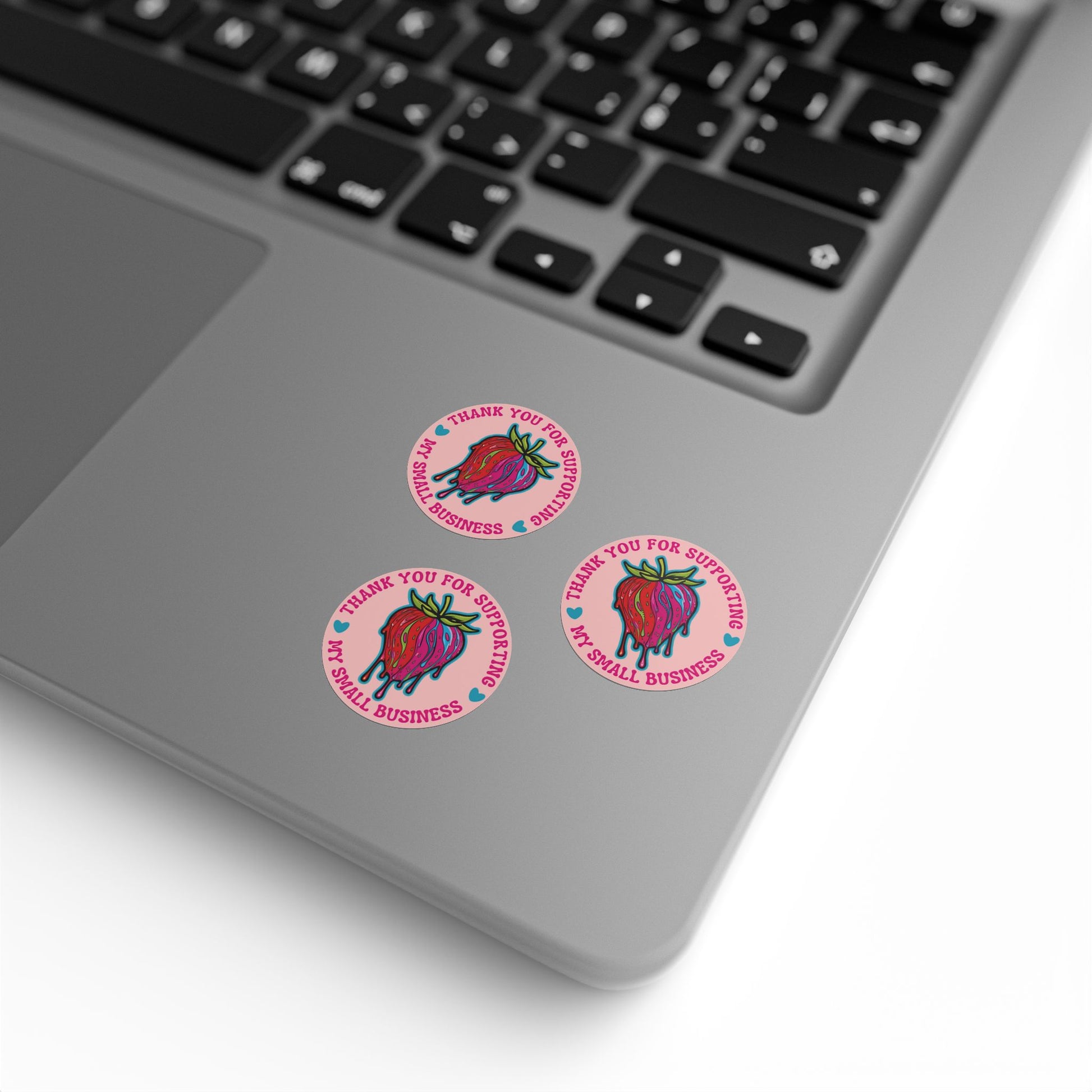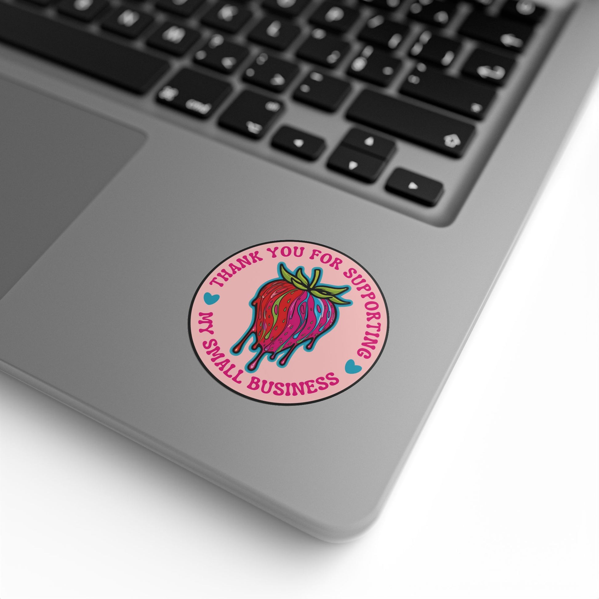 Each sticker features a vibrant, dripping strawberry illustration and the message "Thank you for supporting my small business", with the ability to personalize it with your business name or custom text. Just let us know in the custom special intructions box upon checkout!
