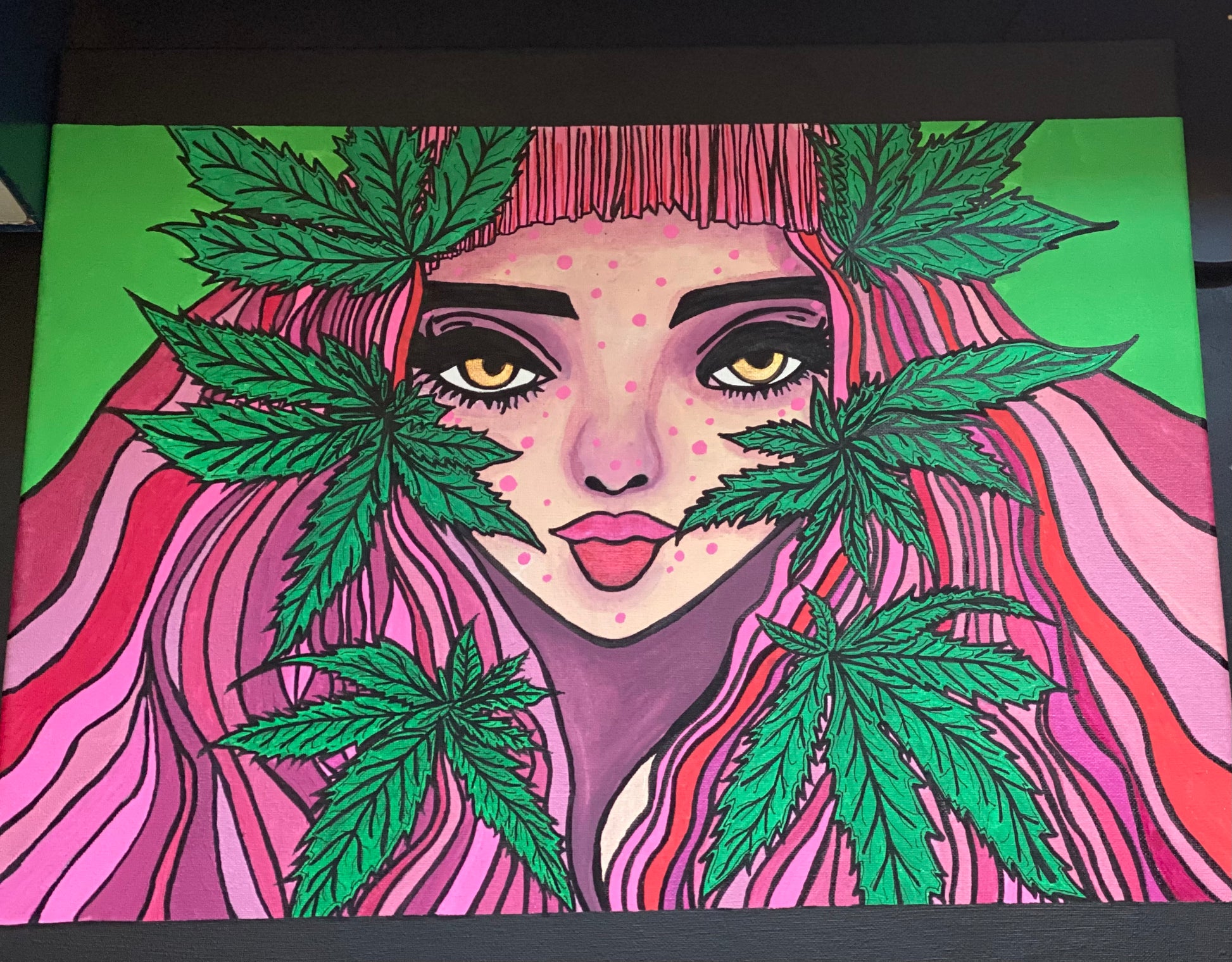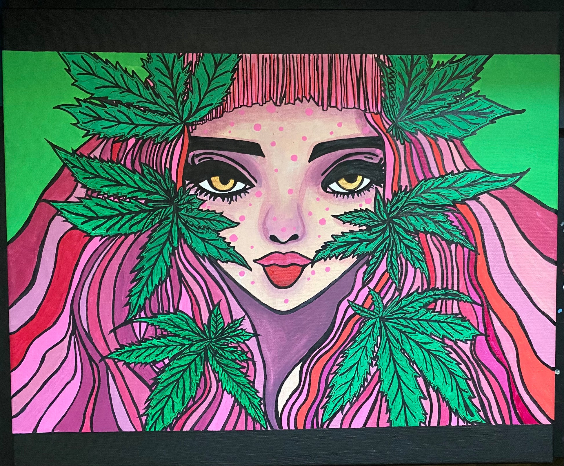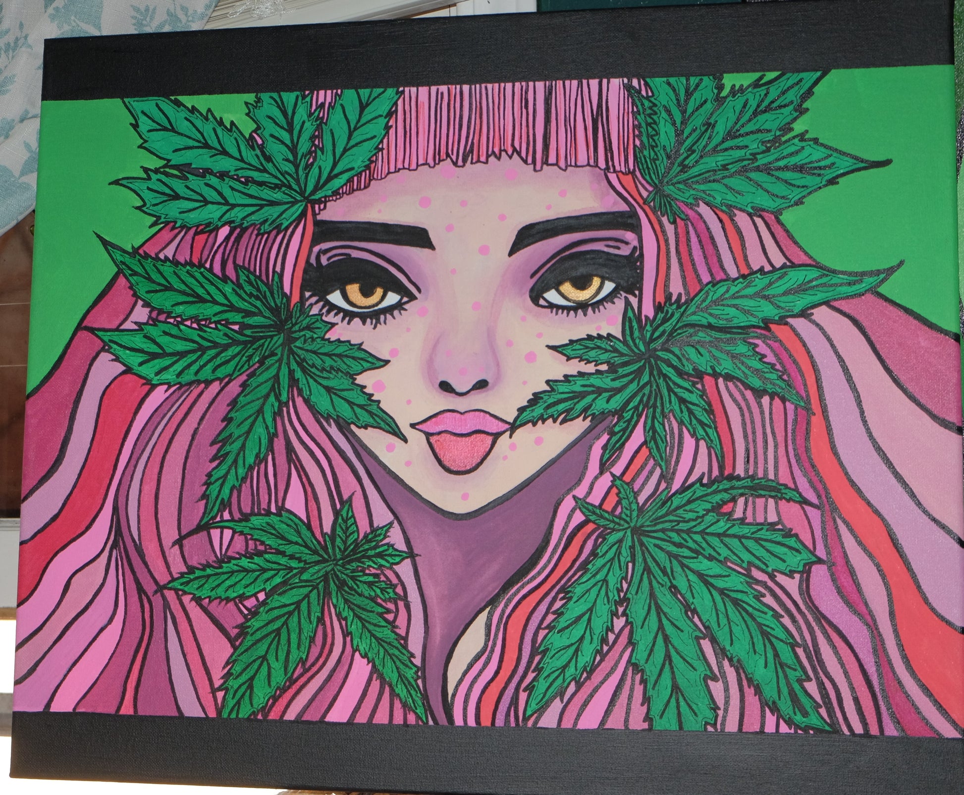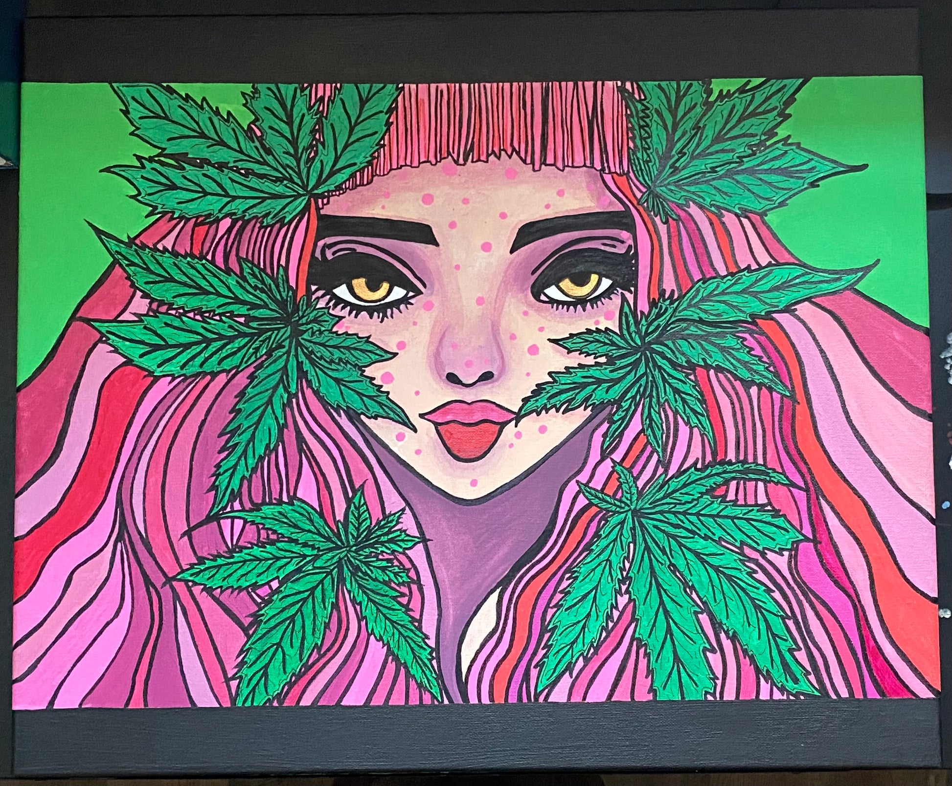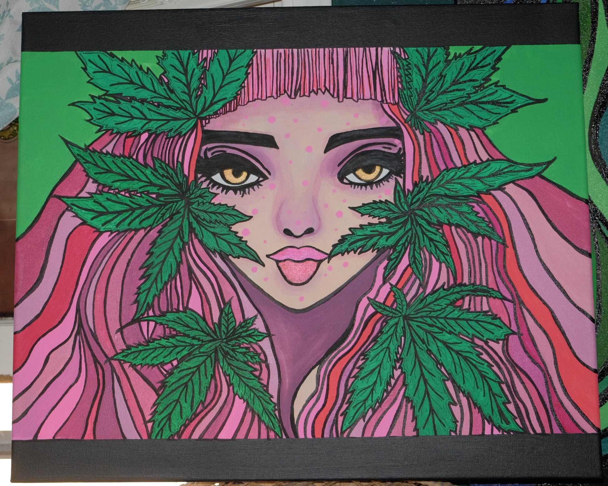 She came to life on this canvas, her golden eyes holding quiet wisdom, her flowing hair carrying whispers of freedom. The cannabis leaves woven through are a symbol—maybe of peace, maybe of rebellion, maybe of something only she knows.