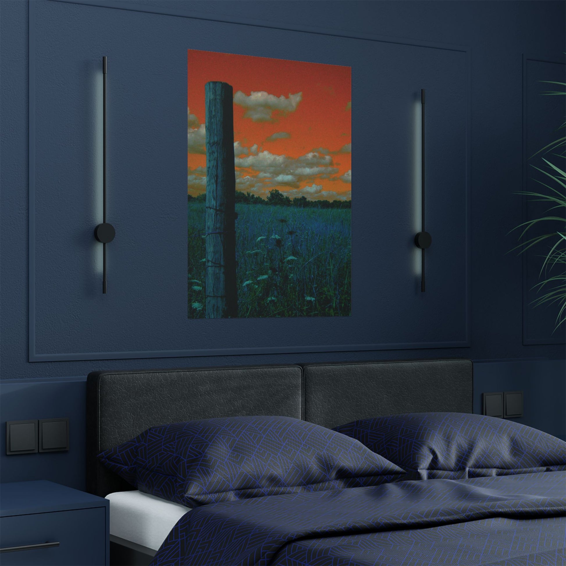 "Through the Fence" captures a striking view of a quiet country field as seen from a weathered wooden post, rendered in a surreal RGB-swapped palette that turns the sky into a vivid wash of clouds and color. This photograph is printed on premium 300gsm satin paper, offering a luminous sheen that enhances every detail with painterly depth.